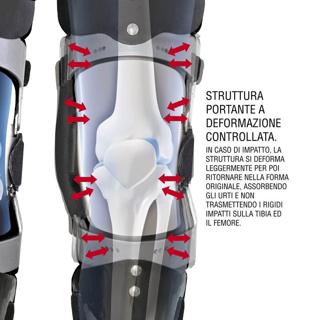 -POSIZIONAMENTO DELLO SNODO SULL’ARTICOLAZIONE Il preciso posizionamento dello snodo sul centro dell’articolazione del ginocchio, assicura maggior protezione in caso di distorsioni, permette una perfetta naturalità del movimento e mantiene costante il posizionamento evitando le migrazioni.